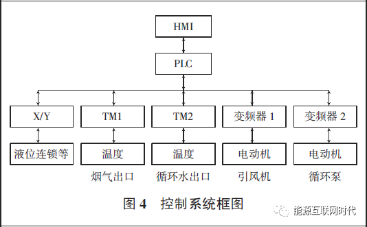 如图5所示,上层模块针对HMI操作,主要完成参数设定、运行状态、报警和数据表格显示、急停、密码修改。下层模块的功能是:接收温度反馈值(PV)和连锁信号,传送给CPU,并与设定值(SV)比较,经逻辑判断和数据计算处理,输出各操作值(MV),自动控制引风机和循环水泵转速,达成清洁烟气温度、循环水温度恒定的目标。